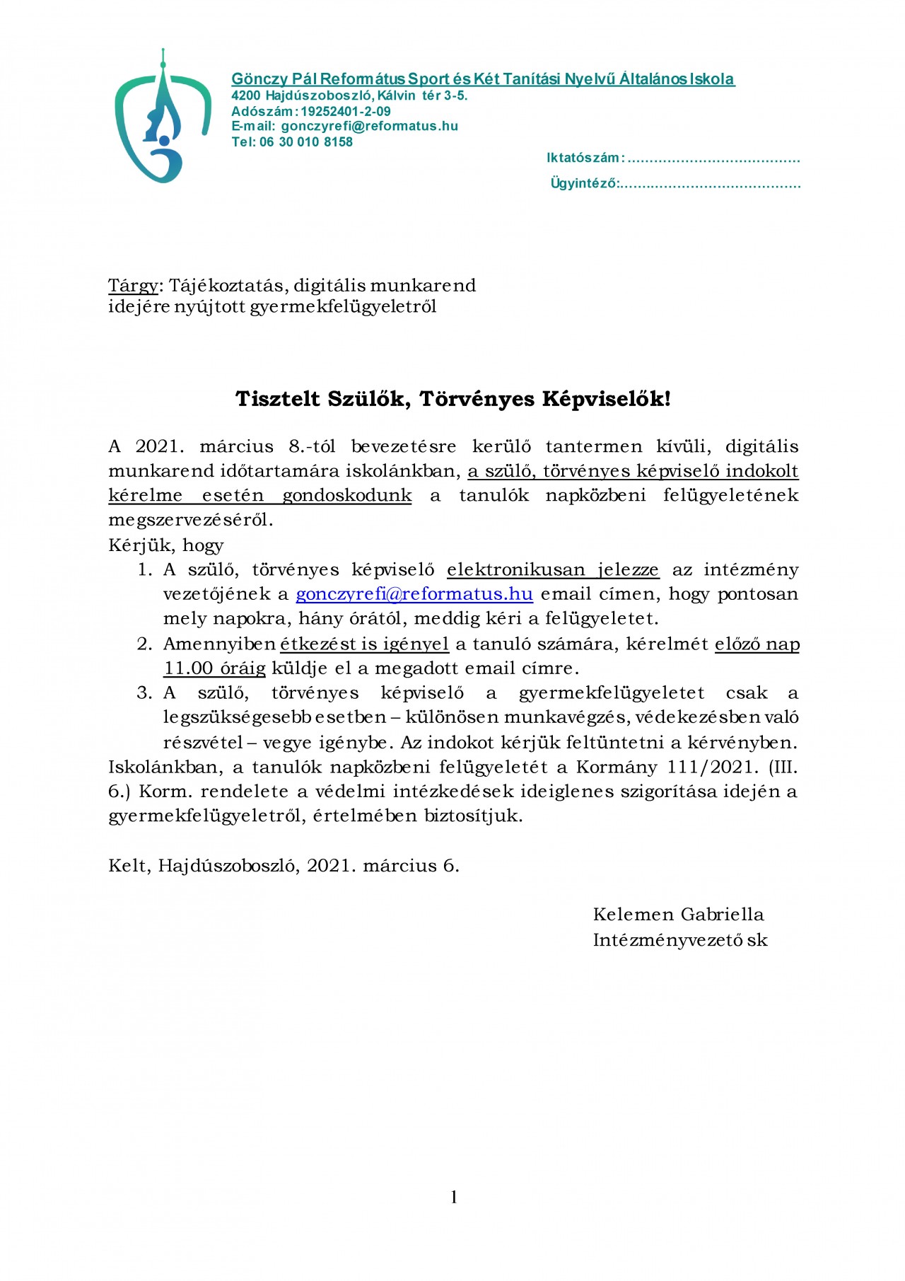 1. A szülő, törvényes képviselő elektronikusan jelezze az intézmény vezetőjének a gonczyrefi@reformatus.hu email címen, hogy pontosan mely napokra, hány órától, meddig kéri a felügyeletet.