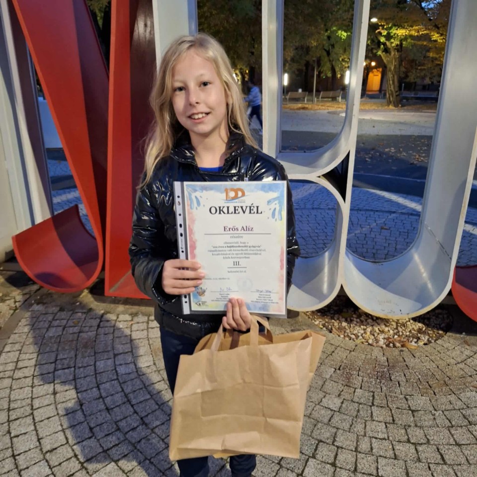 A "100 éves a hajdúszoboszlói gyógyvíz" városi rajzpályázaton Erős Alíz 5. a osztályos tanuló 3.helyzést ért el a gyönyörű rajzával. Az ünnepélyes dijátadóra tegnap a Pávai fesztiválon került sor.
