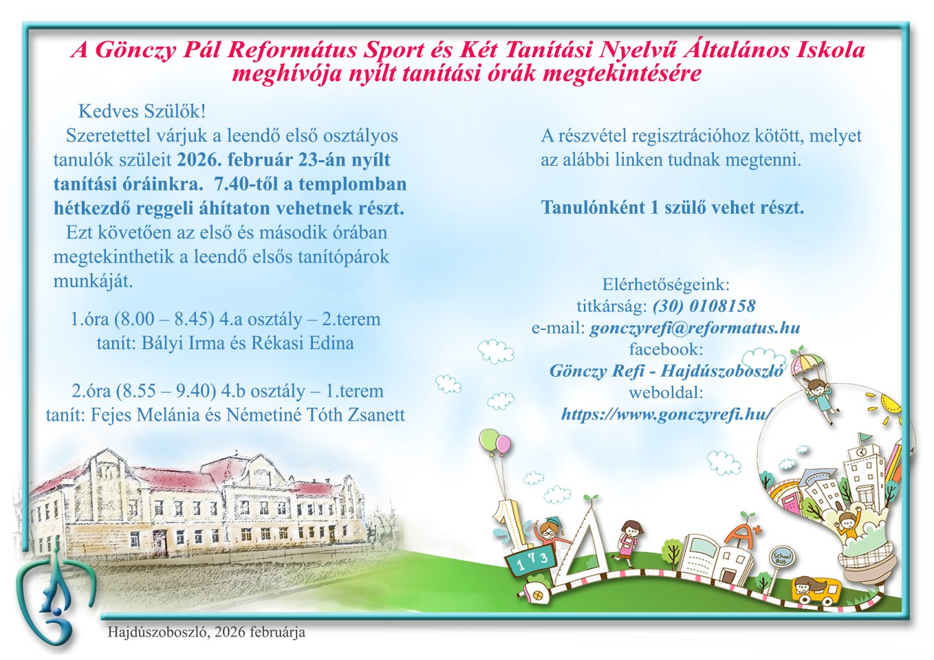 Szeretettel várjuk a leendő első osztályos tanulók szüleit 2026. február 23-án nyílt tanítási óráinkra. 7.40-től a templomban hétkezdő reggeli áhítaton vehetnek részt.